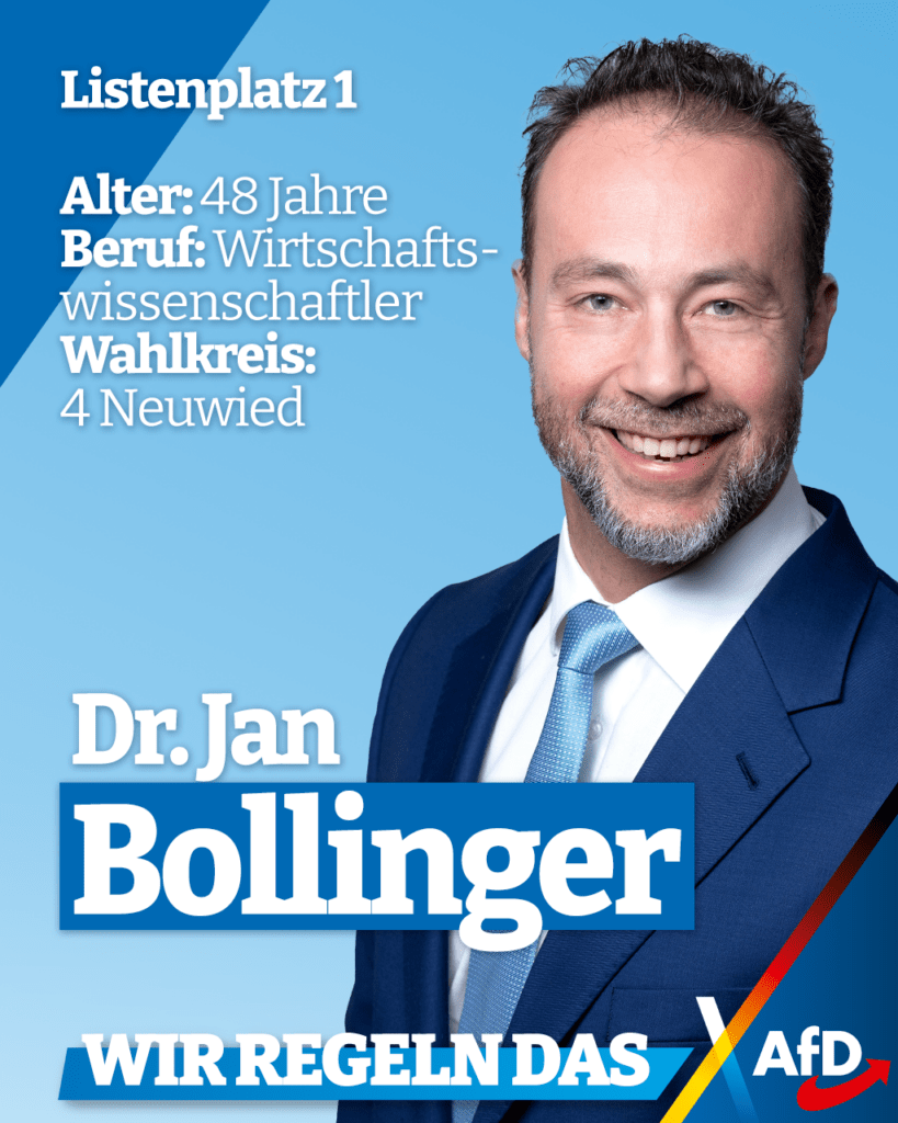 Wir stellen Euch ab heute in regelmäßigen Abständen die ersten 30 Kandidaten unserer Landesliste vor. Den Anfang machen wir mit unserem Spitzenkandidaten Dr. Jan Bollinger, der zugleich als Direktkandidat im Wahlkreis 4 Neuwied für die AfD antritt.